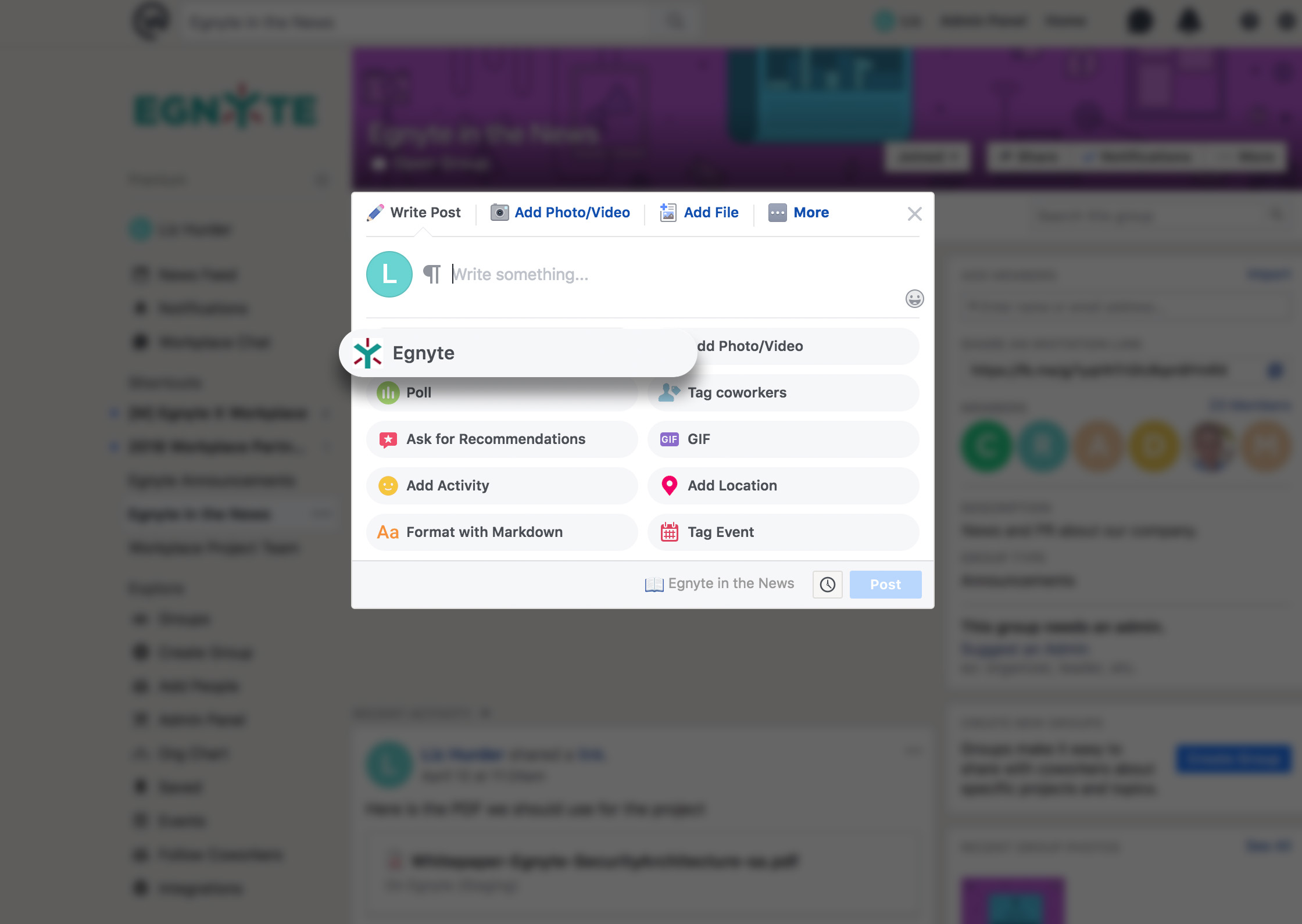Egnyte’s Ecosystem Team is always working to add integrations that help our customers boost productivity and when our leading partners announce new technology for collaboration, we get excited.We are proud to introduce Egnyte Connect for Workplace by Facebook. Workplace is a rich digital space where users can work together, share ideas, and swap expertise. Our new integration provides a few different ways to send Egnyte Connect links directly in Workplace. First, when you write a post in Workplace, the Egnyte Connect button appears, allowing users to choose files directly from Egnyte.