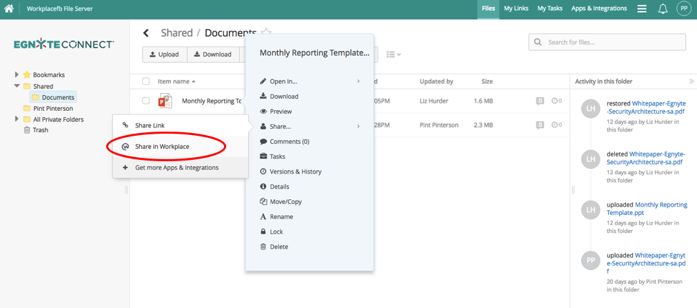We also allow you to share files directly to Workplace from within Egnyte Connect. Simply click on the Egnyte file and choose “Share in Workplace” to send.