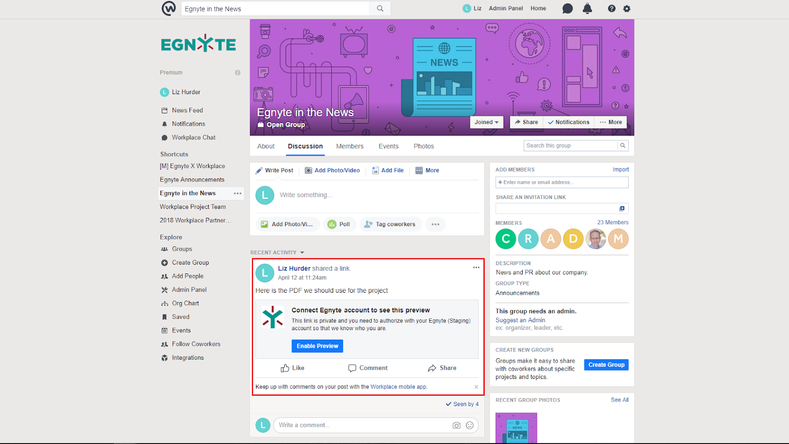 Workplace also renders thumbnails for documents or images shared via public links. When sharing private links, Egnyte will automatically enforce permissions to ensure team members have access to the document(s) they click on.