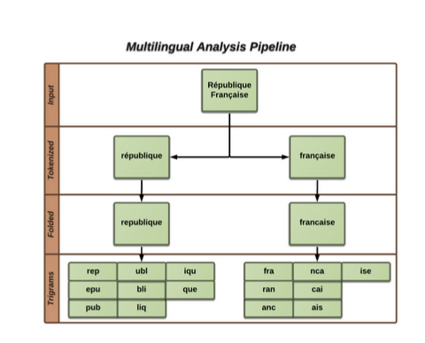 Ngrams FilterThis is the Filter present in elasticsearch, which splits tokens into subgroups of characters. This is very useful for fuzzy matching because we can match just some of the subgroups instead of an exact word match. Since ngrams are space heavy, we use them only on short, bounded fields, such as title and file name, but not on text blobs in the document content - internally we use trigrams.Example ngrams[min=2, max=5]"search" --> ["se", "sea", "sear", "searc", "ea", "ear", "earc", "earch", "ar", "arc", "arch", "rc", "rch", "ch"]Example trigrams[min=3, max=3]"search" --> ["sea", "ear", "arc", "rch"]The part of our metadata analysis pipeline dedicated for multilingual looks like this: