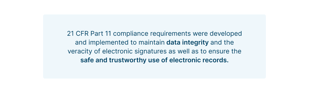 21 CFR Part 11 provides an FDA-approved set of rules for using electronic signatures and records. Using various controls and systems, organizations can take advantage of technology's productivity and operation benefits. 21 CFR Part 11 compliance helps to protect the integrity of data throughout the life sciences industry, which, ultimately, ensures the safety of products.