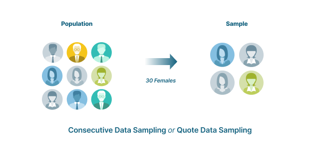 Gathers data from sources that meet the criteria until the desired sample size is attained. This method ensures equal representation in subsets within the sample. With consecutive or quota sampling, the proportion of the sample does not match the proportion of the group to the population.